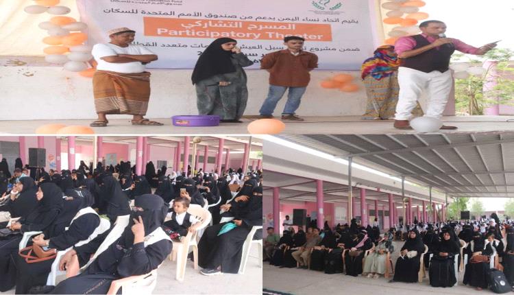 أقام اتحاد نساء اليمن فرع لحج صباح اليوم الأربعاء فعالية " المسرح التشاركي " بمدرسة خديجة للبنات بمدينة الحوطة والتي تمحورت حول تناول عدة قضايا لمناصرة المرأة والفتاة مثل حقها في التعليم ، والمساواة في الحقوق والإختيار داخل إطار الأسرة، ومنع الزواج المبكر .