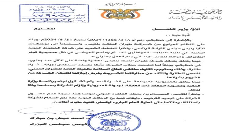 بالإشارة إلى خطابكم رقم (و ن / 3 / 1366) بتاريخ 31 / 8 / 2024م، وبناءً على التظلم المرفوع من شركة طيران الملكة بلقيس، واستنادًا إلى توجيهات الأخ/ مجلس القيادة الرئاسي، ونظرًا للضغط الشديد على شركة الخطوط الجوية اليمنية في تلبية احتياجات المواطنين للسفر ونقلهم المرضى في ظل محدودية توفر الطائرات، تم توجيهنا للتكليف الإنساني إلى العمل بما يلي: