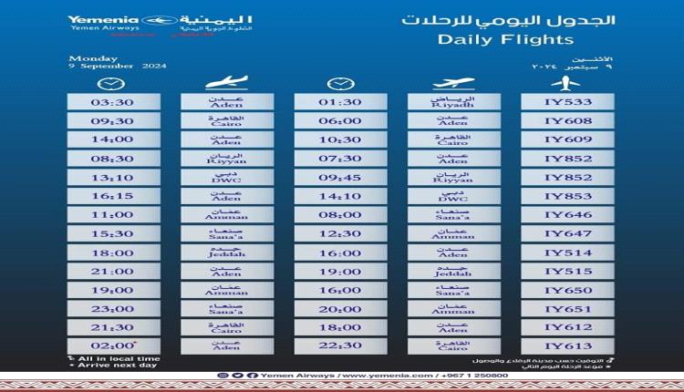 مواعيد اقلاع رحلات طيران اليمنية ليوم غد الاثنين كالتالي: