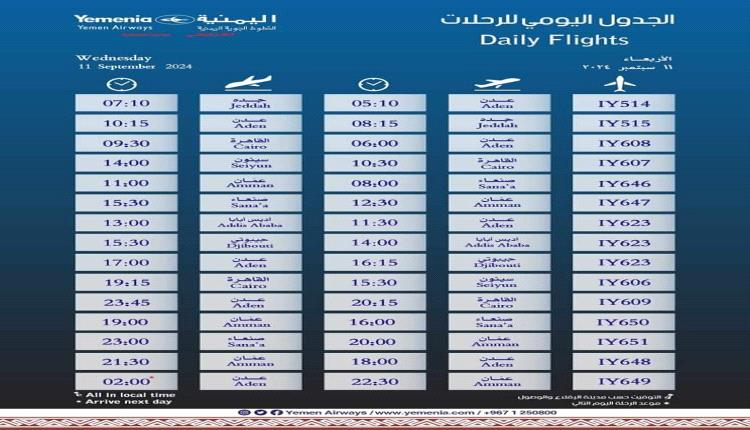 مواعيد اقلاع رحلات طيران اليمنية ليوم غد الأربعاء كالتالي:
