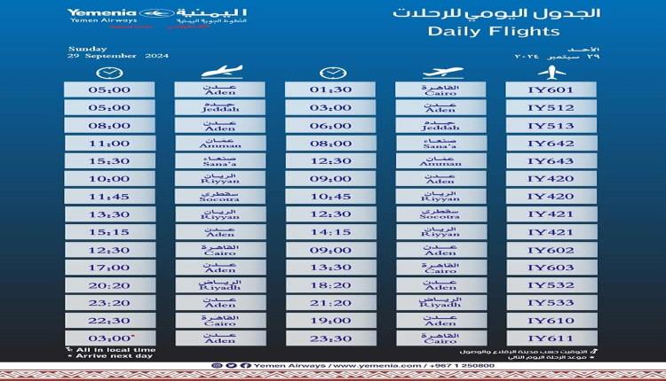 مواعيد اقلاع رحلات طيران اليمنية لليوم الاحد كالتالي:
