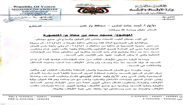 أصدر مكتب الأوقاف والإرشاد بالعاصمة عدن، بيانا أوضح فيه تفاصيل ما أثير في مسجد سعد بن معاذ في مديرية المنصورة وذلك بموجب مذكرة رسمية رفعت لوزير الدولة محافظ العاصمة عدن الأخ/ أحمد حامد لملس لحل الأشكاليات والعراقيل التي تسببت بالقلاقل والفتن في بيت الله .