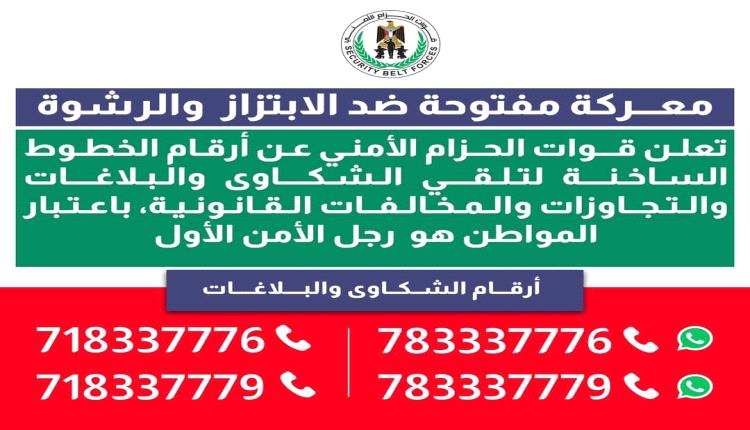 تحت شعار معركة مفتوحة ضد الابتزاز والرشوة، أعلنت قوات الحزام الأمني عن أرقام الخطوط الساخنة؛ لتلقي الشكاوي والبلاغات عن التجاوزات والمخالفات القانونية.