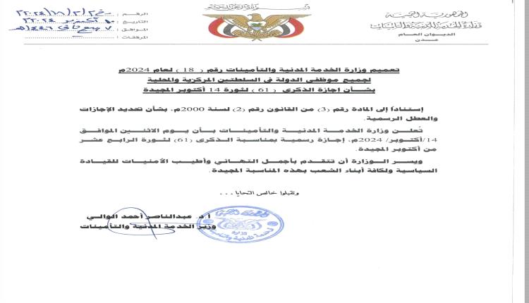 أعلنت وزارة الخدمة المدنية والتأمينات، في تعميم رسمي، أن يوم الاثنين الموافق 14 أكتوبر سيكون إجازة رسمية في جميع مؤسسات الدولة، وذلك احتفالًا بالذكرى 61 لثورة 14 من أكتوبر المجيدة.
