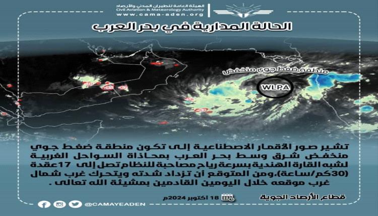 وأكد المركز ، في بيان له، أن أحدث صور الأقمار الصناعية، اليوم الجمعة، تشير إلى تكون منطقة ضغط جوي منخفض شرق وسط بحر العرب بمحاذاة السواحل الغربية لشبه القارة الهندية بسرعة رياح مصاحبة للنظام تصل إلى17عقدة تقريباً (30كم/ساعة).
