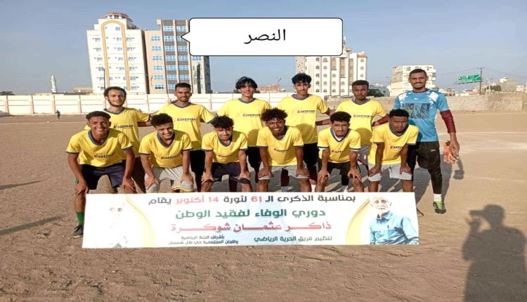بلغ فريق النصر الدور الثاني من منافسات دوري فقيد الوطن ذاكر عثمان شوكرة وذلك على حساب منافسه نجوم القاهرة بركلات الترجيح 3/4 بعد التعادل الإيجابي في نتيجة المباراة 3/3 ويأتي ذلك ضمن منافسات الدور الأول من الدوري والذي يقام بمشاركة 42 فريقاً شعبياً يمثلون مختلف مديريات محافظة عدن ومن خارجها ويقام بنظام خروج المغلوب من مرة واحدة ويقام على ملعب مدرسة إدريس حنبلة وبتنظيم فريق الحرية الرياضي وبإشراف اللجنة الرياضية واللجان المجتمعية حي تلال شمسان بقيادة الكابتن محمود ثابت.
