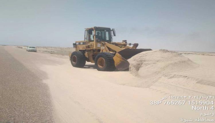 لليوم الرابع على التوالي تواصل الفرق الفنية التابعة للجهة المنفذة في إزاحة الرمال في الخط الساحلي الدولي من منطقة عرقة إلى عين بامعبد مديرية رضوم محافظة شبوة بطول 80 كيلومترًا وبتمويل من صندوق صيانة الطرق والجسور بالمركز الرئيسي العاصمة عدن .