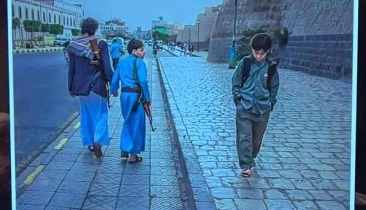 وتظهر الصورة طفلا يمنيا في الشارع يرتدي الزي والحقيبة المدرسية، وطفلا يحمل السلاح بالقرب منه وبجوار هذا الطفل المسلح شخص آخر يحمل السلاح.