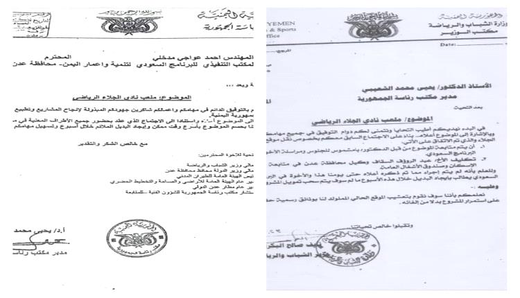 وأوضح المصدر أن البرنامج السعودي للتنمية واعمار اليمن قد أكد سابقا انسحابه من تمويل المشروع في حال لم تحل الخلافات وتحديد موقع جديد لبناء الملعب الخاص بنادي الجلاء الرياضي والثقافي.