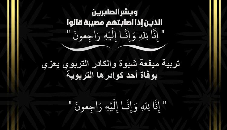 بعث مدير التربية والتعليم بمديرية ميفعة محافظة شبوة برقية تعزية بوفاة الأستاذة الفاضلة اسمهان صالح محمد عبدالسيد إحدى معلمات مدرسة جول الريدة بنات