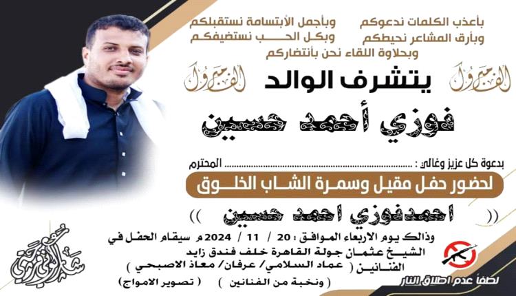 بدعوة كل عزيز وغالي لحضور حفل مقيل وسمرة الشاب الخلوق احمد فوزي احمد حسين