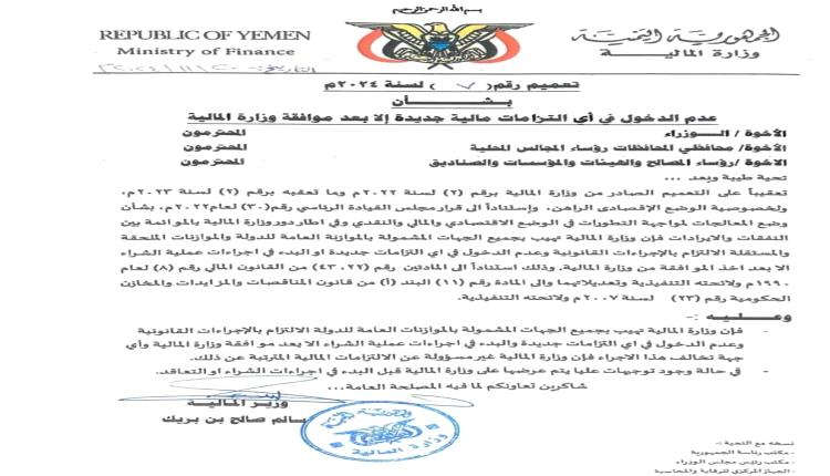 اصدر معالي وزير المالية الاستاذ سالم صالح بن بريك تعميم رقم ( 7 ) لسنة ٢٠٢٤م بشأن عدم الدخول في أي التزامات مالية جديدة إلا بعد موافقة وزارة المالية.