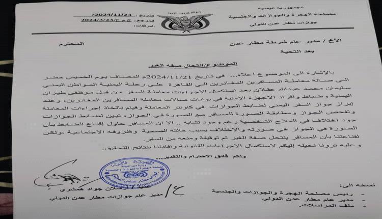 أوقفت سلطة جوازات مطار عدن مسافرا يمنيا مغادرا على متن إحدى شركات الطيران العاملة في مطار عدن الدولي مساء اليوم يدعى/ س.م.ع.ع يحمل جواز يمني ، وذلك بعد استكمال إجراءات سفره من قبل شركة الطيران وقدومه إلى صالة معاملة الركاب المغادرين.