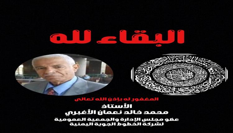 بقلوب مؤمنه بقضاء الله وقدرة تلقينا نبأ وفاة الأستاذ محمد خالد نعمان الأغبري عضو مجلس الإدارة والجمعية العمومية للخطوط الجوية اليمنية والذي وافاة الأجل صباح يومنا هذا الأحد