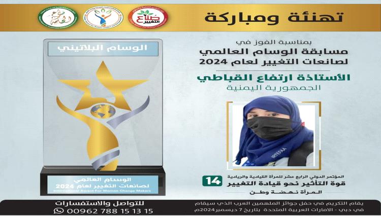 في إنجاز حديث يضاف إلى سجل المرأة اليمنية، تمكنت الناشطة البيئية اليمنية، ارتفاع القباطي، من حصد الوسام البلاتيني في مسابقة صانعات التغيير للعام 2024.
