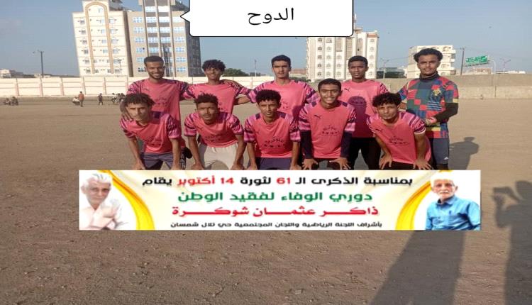 ضرب فريق الدوح موعداً ناريا مع منافسه فريق البي كلاس وذلك في نهائي دوري فقيد الوطن ذاكر عثمان شوكرة ويأتي ذلك بعد فوز الدوح على حساب النصر برباعية نظيفة في نصف النهائي الدوري والي يقام بمشاركة 42 فريقاً شعبياً يمثلون مختلف مديريات محافظة عدن ومن خارجها ويقام بنظام خروج المغلوب من دور واحد وتقام جميع مباريات الدوري على ملعب مدرسة إدريس حنبلة وبتنظيم فريق الحرية الرياضي وبإشراف اللجنة الرياضية واللجان المجتمعية حي تلال شمسان بقيادة الكابتن محمود ثابت أبو رغيد.