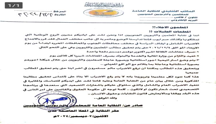 استجابة لنداءات فروع النقابة العامة للمعلمين والتربويين الجنوبيين في المحافظات الجنوبية ، ووقوفا أمام البيانات النقابية الصادرة عنها أقرت النقابة العامة للمعلمين والتربويين الجنوبيين ومن مقرها الكائن في مديرية المعلا في اجتماعها اعلان الإضراب العام في سائر محافظات الجنوب والمحافظات المحررة ابتداءا من الاربعاء ٤ ديسمبر ٢٠٢٤م حتى يتم تحقيق المطالب ، والتي تمثلت بما يلي :