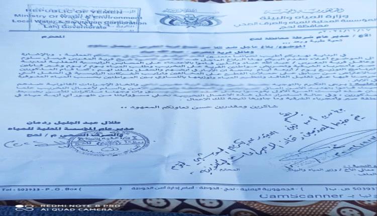 ابلغ مدير عام مؤسسة المياة بمحافظة لحح طلال عبدالجليل ردمان عن واقعة الاعتداء على المحابس الرئيسية لحقول ابار مياة مغرس ناجي بمديرية تبن.