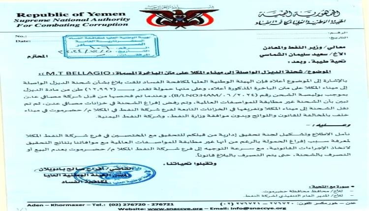 الوثيقة الرسمية الموجهة من الهيئة العليا لمكافحة الفساد، إلى وزير النفط أكدت أنه تم تفريغ الشحنة في خزانيات شركة النفط فرع حضرموت بميناء خلف في المكلا.