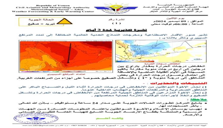 أكد مركز التنبؤات الجوية والإنذار المبكر في الهيئة العامة للطيران المدني والأرصاد، في نشرته الجوية التحذيرية الصادرة مساء اليوم الاثنين 09 ديسمبر 2024م، أن صور الأقمار الاصطناعية ومخرجات النماذج العددية العالمية المختلفة، تشير إلى تمدد المرتفع السيبيري.
