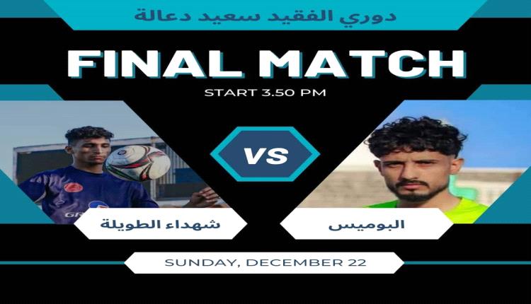 ويلتقي فريقي البوميس وشهداء الطويلة على ملعب الهوكي الترابي الواقع بمدينة كريتر في المباراة النهائية التي يتوقع بأن تحظى بحضور جماهيري كبير كالعادة