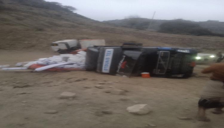 وافاد شهود عيان إن الشاحنة انقلبت في احد منعطفات الطريق في منطقة مُكْيّحِل اثر تعثرها وعجزها عن المرور جراء الحفريات وعدم صيانة الطريق.