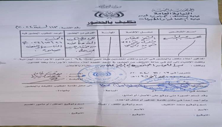 تسلم الصحفي محمد عبدالواسع، صحفي في صحيفة 14 أكتوبر طلب حضور إلى نيابة الصحافة والمطبوعات الخميس القادم.
