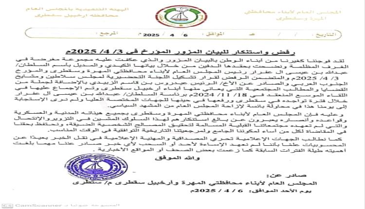 أصدر المجلس العام لأبناء محافظتي المهرة وأرخبيل سقطرى، بيان توضيحي، عبر فيه عن رفضه واستنكاره، صدور بيان مزور بإسم المجلس.