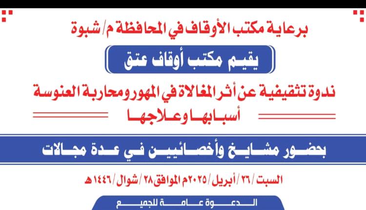 وقد أعلن مكتب الأوقاف والإرشاد بالمديرية السبت القادم عن إقامة ندوة تثقيفية عن أثر المغالاة في المهوروأسبابها وعلاجها بحضور كوكبة من المشايخ واختصاصيين في جميع المجالات المتعلقة بهذا الموضوع.
