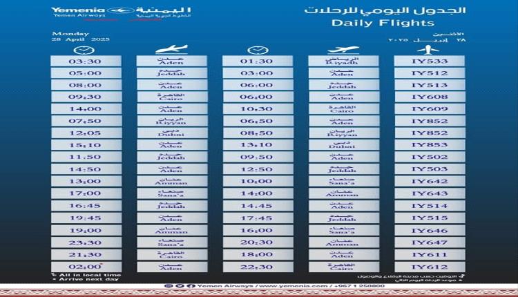 مواعيد اقلاع رحلات طيران اليمنية لليوم الاثنين كالتالي