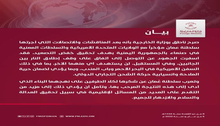 وقال متحدث باسم الخارجية العُمانية: "بعد المناقشات والاتصالات التي أجرتها سلطنة عُمان مؤخراً مع الولايات المتحدة الأمريكية والسلطات المعنية في صنعاء بالجمهورية اليمنية بهدف خفض التصعيد، أسفرت الجهود عن التوصل إلى اتفاق يقضي بوقف إطلاق النار بين الجانبين، مع التزام الطرفين بعدم استهداف أحدهما للآخر في المستقبل، بما في ذلك السفن الأمريكية في البحر الأحمر وباب المندب، وبما يضمن حرية الملاحة وسلاسة حركة الشحن التجاري الدولي".