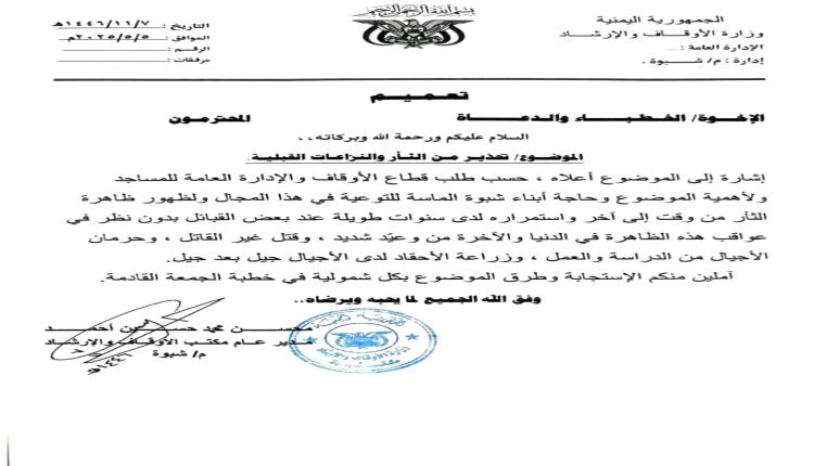 أصدر مكتب الأوقاف والإرشاد بمحافظة شبوة بقيادة الشيخ محسن محمد حسين أحمد تعميماً لخطبة مساجد المحافظة يدعوهم للتحذير من الثأر والنزاعات القبلية التي تضر بالجميع. جاء ذلك حسب طلب قطاع الأوقاف والإدارة العامة للمساجد، ولأهمية الموضوع وحاجة أبناء شبوة الماسة للتوعية في هذا المجال، ولظهور ظاهرة الثأر من وقت إلى آخر لسنوات طويلة عند بعض القبائل، بدون النظر في عواقب هذه الظاهرة في الدنيا والآخرة من وعيد شديد، وقتل غير القاتل، وحرمان الأجيال من الدراسة والعمل، وزراعة الأحقاد لدى الأجيال جيل بعد جيل.