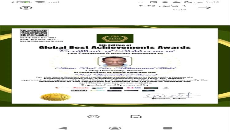 نال الدكتور محمد فضل محمد عبدالله الاستاذ المساعد في قسم الرياضيات جامعة لحج جائزة أفضل باحث في الرياضيات للعام 2025 ( وهي تمنح افتراضيا online أو حضوريا هناك)