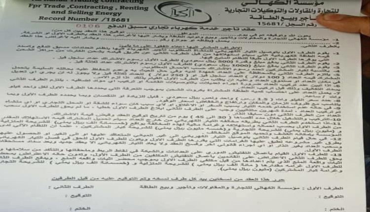 أطلعنا مؤخرًا على عقد صادر عن جهة تجارية خاصة تُدعى "مؤسسة الكهالي للتجارة والمقاولات والتوكيلات وتأجير وبيع الطاقة". هذا العقد ينص صراحة على تقديم خدمة تأجير طاقة كهربائية تجارية للمواطنين داخل عدن، مقابل مبالغ مالية ووفق اشتراطات يقرها التاجر. وهنا لا بد من التوضيح للرأي العام:
