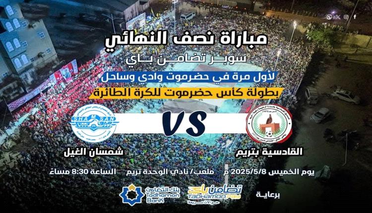 ضمن مباريات بطولة مربع الذهب لابطال النخبة لأبطال "تضامن باي" للكرة الطائرة في محافظة حضرموت، والتي تقام برعاية تضامن باي للحوالات السريعة - المقدمة من بنك التضامن، سيلعب اليوم الخميس الثامن مايو، فريقا القادسية بخيلة والرضيمة من تريم، مع ضيفه القادم من ساحل حضرموت وتحديدا مدينة غيل باوزير.