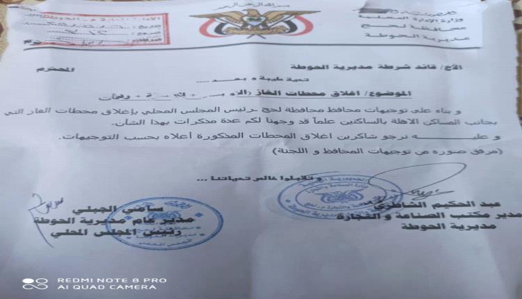 واوضحت المذكرة الصادرة عن مدير عام الحوطة ومكتب الصناعة بالحوطة انه سبق وتم التوجيه بهذا الشآن وهناك توجيهات من محافظ المحافظة.
