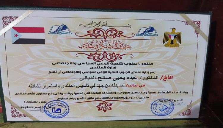 تشرفت اليوم الخميس الموافق 8 مايو 2025م بتكريمي من قبل الهيئة الإدارية لمنتدى الجنوب لتنمية الوعي السياسي والاجتماعي ، ممثلة برئيس المنتدى السفير قاسم عسكر جبران والمدير التنفيذي للمنتدى الدكتور عارف السنيدي ؛ هذا المنتدى الفتي الذي شاركنا معا في تأسيسه في إغسطس 2022م وشكلت لجنة تحضيرية لذلك وفيما بعد تم إشهاره وترخيصه بمزاولة نشاطه الفكري والثقافي . يقع مقر المنتدى في مدينة الشعب مديرية البريقا في منزل رئيس المنتدى. وهاهو بعد هذه السنوات القليلة يقيم حفلا تكريمياٍ لمؤسسيه من قبل ولهيئته الإدارية وللنشاطين فيه وهذا يدل على الرغبة في استمراره وتوسيع نشاطه، ولقد وجدناه منظماً ومرتباً ومؤسسياً وقد جاء تأسيس هذا المنتدى في ظروف صعبة يعيشها الجنوب فهو شمعة تضيء في هذه الظروف الحالكة مركزاً على التوعية والتنوير سواءً لأبناء شعبنا ام لنخبه السياسية .