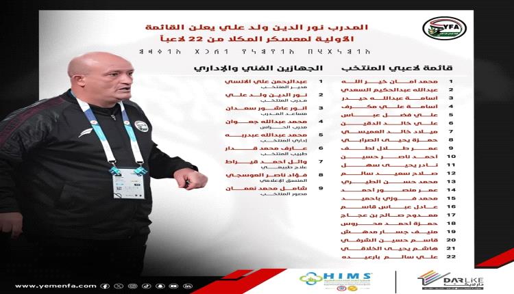 أعلن الجهاز الفني للمنتخب الوطني الأول لكرة القدم، بقيادة المدرب الجزائري نورالدين ولد علي ومساعدة الكابتن انور عاشور عن القائمة الأولية للمنتخب التي ستشارك في المعسكر التدريبي الداخلي الاولي الذي سيقام في مدينة المكلا بمحافظة حضرموت.