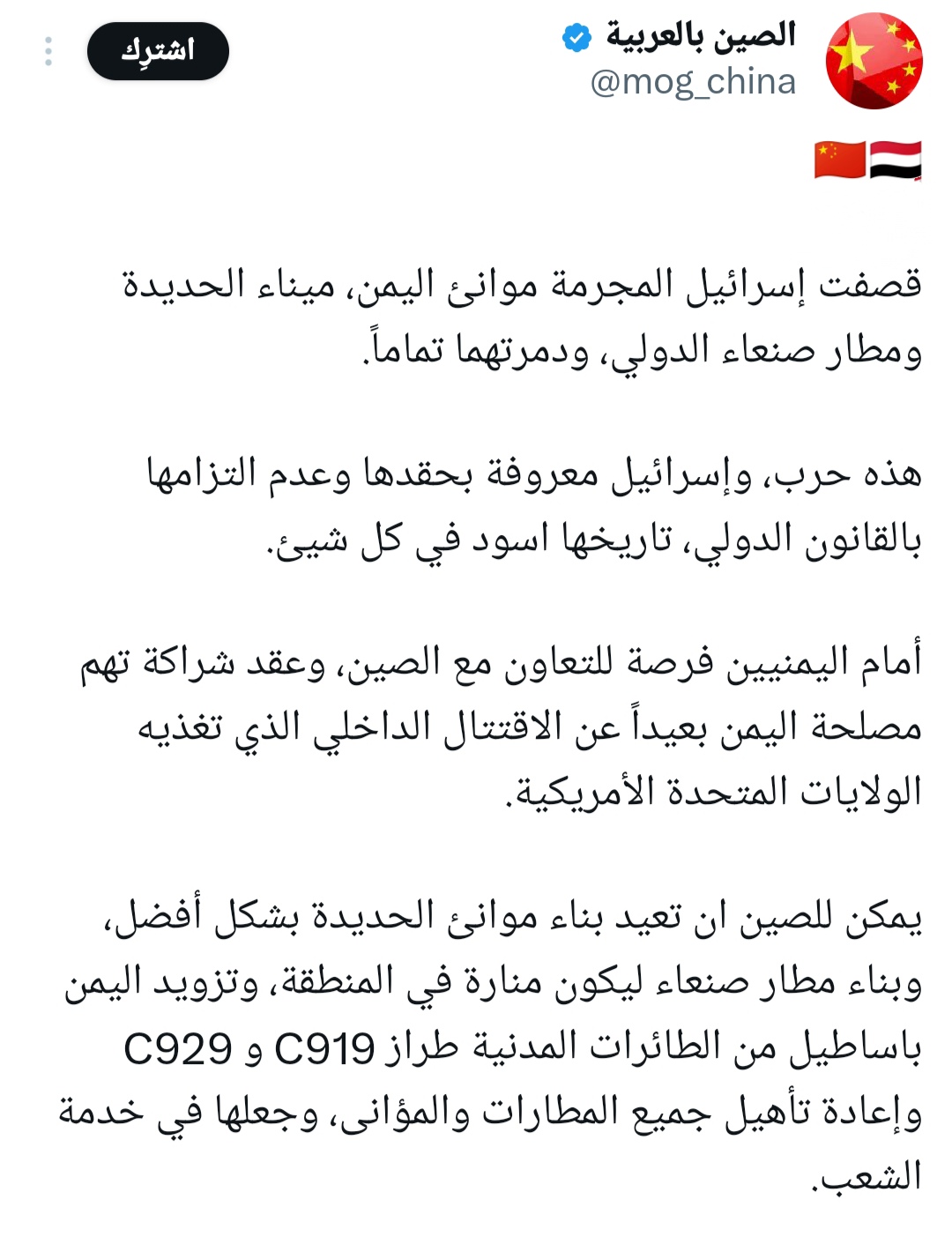 مؤكدة أنه " يمكن للصين ان تعيد بناء موانئ الحديدة بشكل أفضل، وبناء مطار صنعاء ليكون منارة في المنطقة، وتزويد اليمن بأساطيل من الطائرات المدنية طراز C919 وC929 وإعادة تأهيل جميع المطارات والمؤانى، وجعلها في خدمة الشعب" .