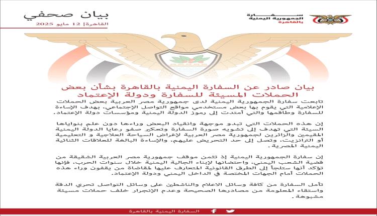 بيان صادر عن السفارة اليمنية بالقاهرة بشأن بعض الحملات المسيئة للسفارة ودولة الإعتماد