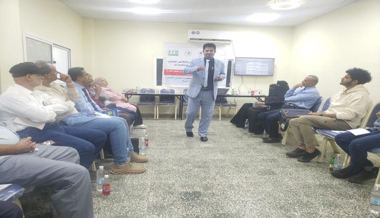 انعقاد الورشة أول تشبيك تدريبي توعوي بين النقابة ومؤسسة أبين للتنمية والشبكة العربية للبيئة والتنمية "رائد" والمدرب د.ياسر باعزب ، نائب عميد كلية الإعلام، رئيس دائرة التدريب والتأهيل في النقابة.