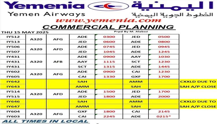مواعيد اقلاع رحلات طيران اليمنية ليوم غد الخميس كالتالي: