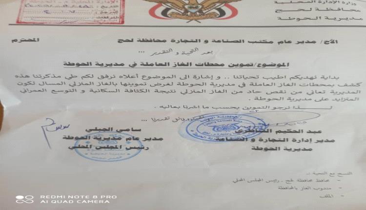 واوضح مدير عام الحوطة ومدير مكتب الصناعة بمذكرتهم نظرا لما تعانيه المديرية من نقص حاد في مادة الغاز المنزلي بسبب الكثافة السكانية والتوسع العمراني، الامر الذي يتطلب تزويد المحطات العاملة بالغاز المنزلي.