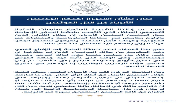 أصدرت السفارة الأمريكية لدى اليمن، اليوم الجمعة، بيان بشأن استمرار احتجاز المدنيين الأبرياء من قبل مليشيا الحوثي الإرهابية.