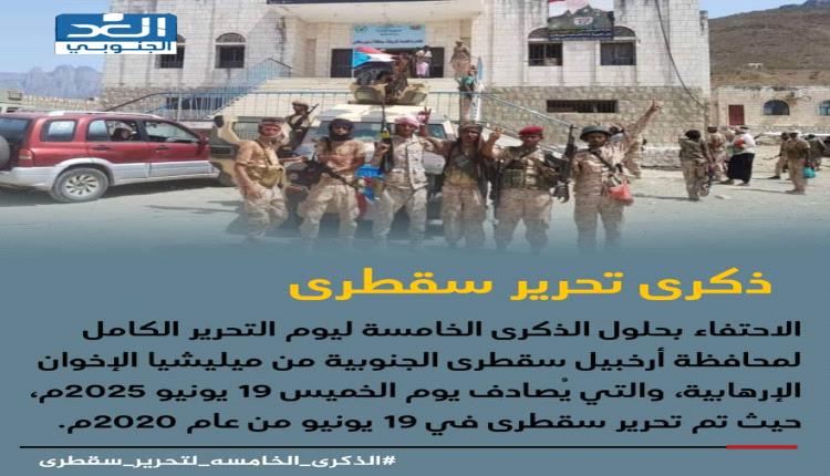 يحتفي ابناء سقطرى والجنوب عامة بيوم التحرير وانتصار السقطريين، تزامنًا مع حلول الذكرى الخامسة ليوم التحرير الكامل لمحافظة أرخبيل سقطرى الجنوبية من ميليشيا الإخوان الإرهابية، والتي تُصادف اليوم الخميس 19 يونيو 2025م، حيث تم تحرير سقطرى في 19 يونيو من عام 2020م.