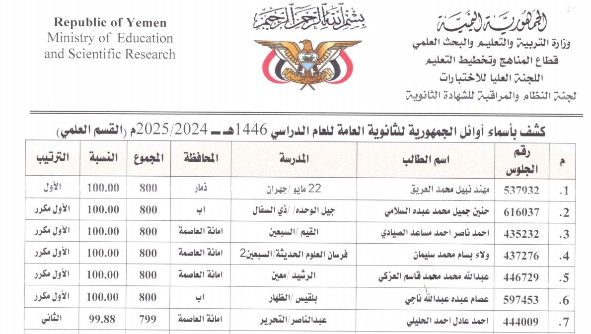 كشوفات أوائل الجمهورية للشهادة الثانوية ثالث ثانوي لكافة الأقسام (علمي ـ أدبي ـ انجليزي) مع احصائية النتيجة، للعام الدراسي ١٤٤٦ﮪ ـ ٢٠٢٥/٢٠٢٤م صور وملف بي دي اف pdf
