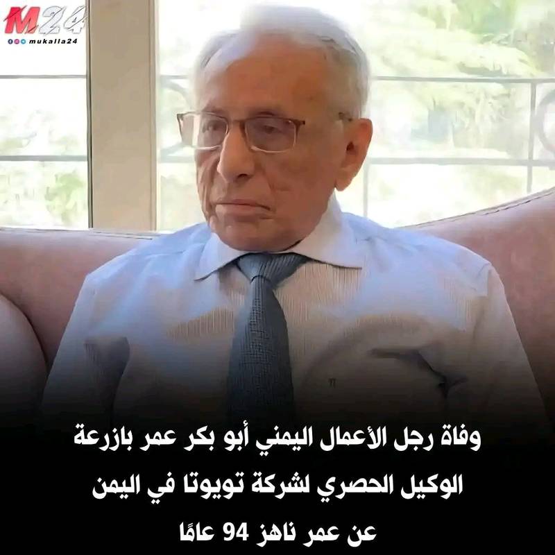 تُوفي اليوم الخميس في العاصمة الأردنية عمّان، رجل الأعمال اليمني المعروف أبو بكر عمر أحمد بازرعة، عن عمر يناهز الـ 95 عامًا.