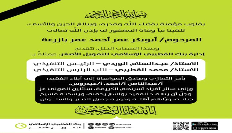 عزّت إدارة بنك القطيبي الإسلامي للتمويل الأصغر، برحيل رجل الأعمال المعروف، المغفور له بإذن الله تعالى/ أبوبكر عمر أحمد عمر بازرعة، الذي وافته المنية بعد مسيرة حافلة بالعطاء والنجاح في مجالات التجارة والاستثمار وخدمة الاقتصاد الوطني.