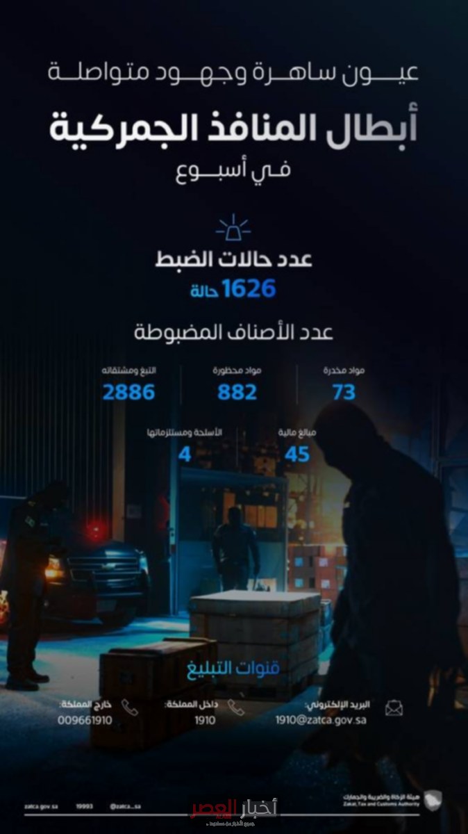 ودعت “زاتكا” المواطنين والمقيمين إلى الإسهام في مكافحة التهريب من خلال الإبلاغ عن أي معلومات تتعلق بهذا الشأن عبر الرقم المخصص للبلاغات الأمنية (1910)، أو البريد الإلكتروني [email protected]، أو الرقم الدولي (009661910).