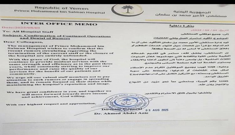 أصدر مستشفى الأمير محمد بن سلمان بالعاصمة عدن مذكرة داخلية لجميع موظفيه، أكد فيها مواصلة عمله ونفى صحة الشائعات التي تم تداولها مؤخرًا حول إغلاق المستشفى أو إنهاء خدمات الكادر الطبي والإداري.